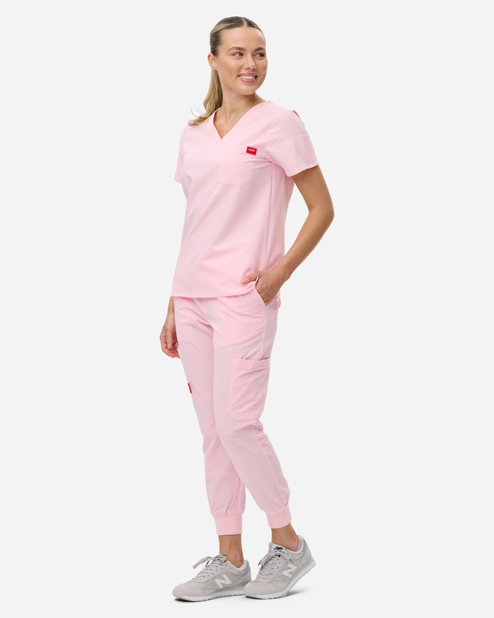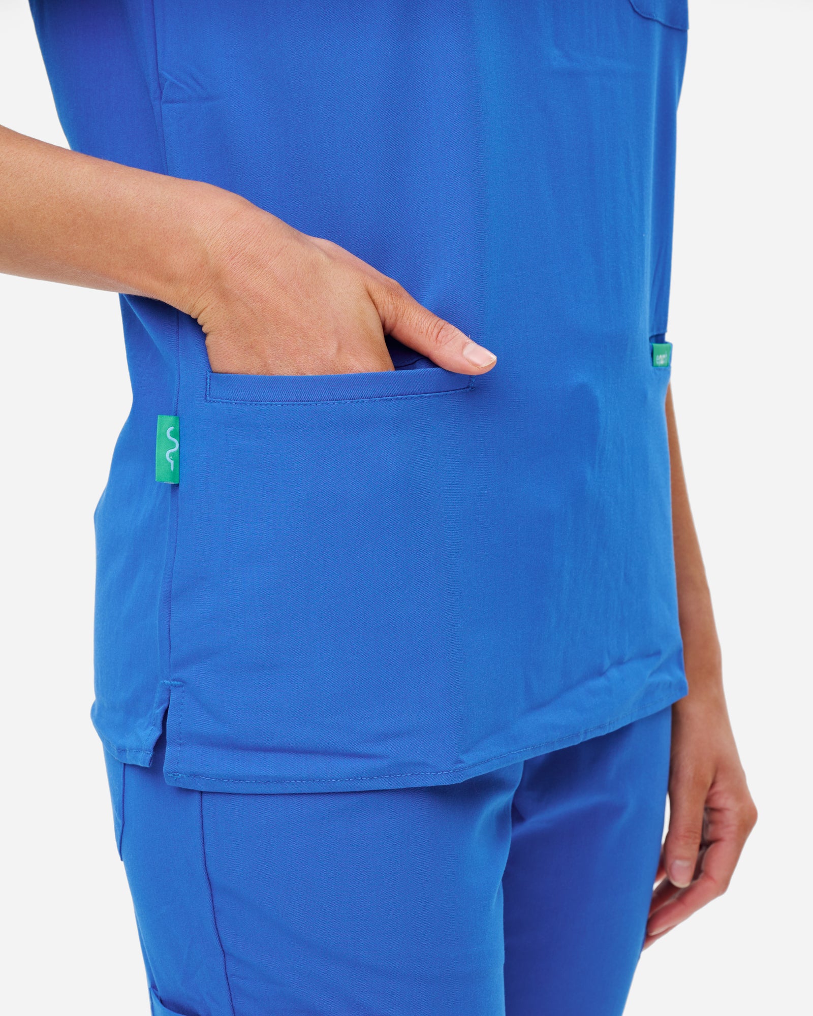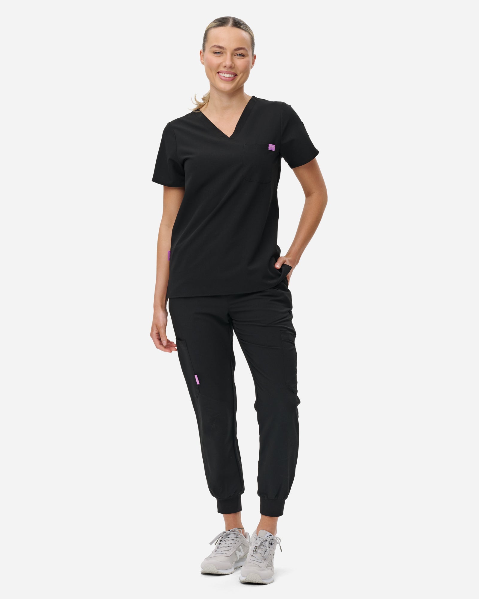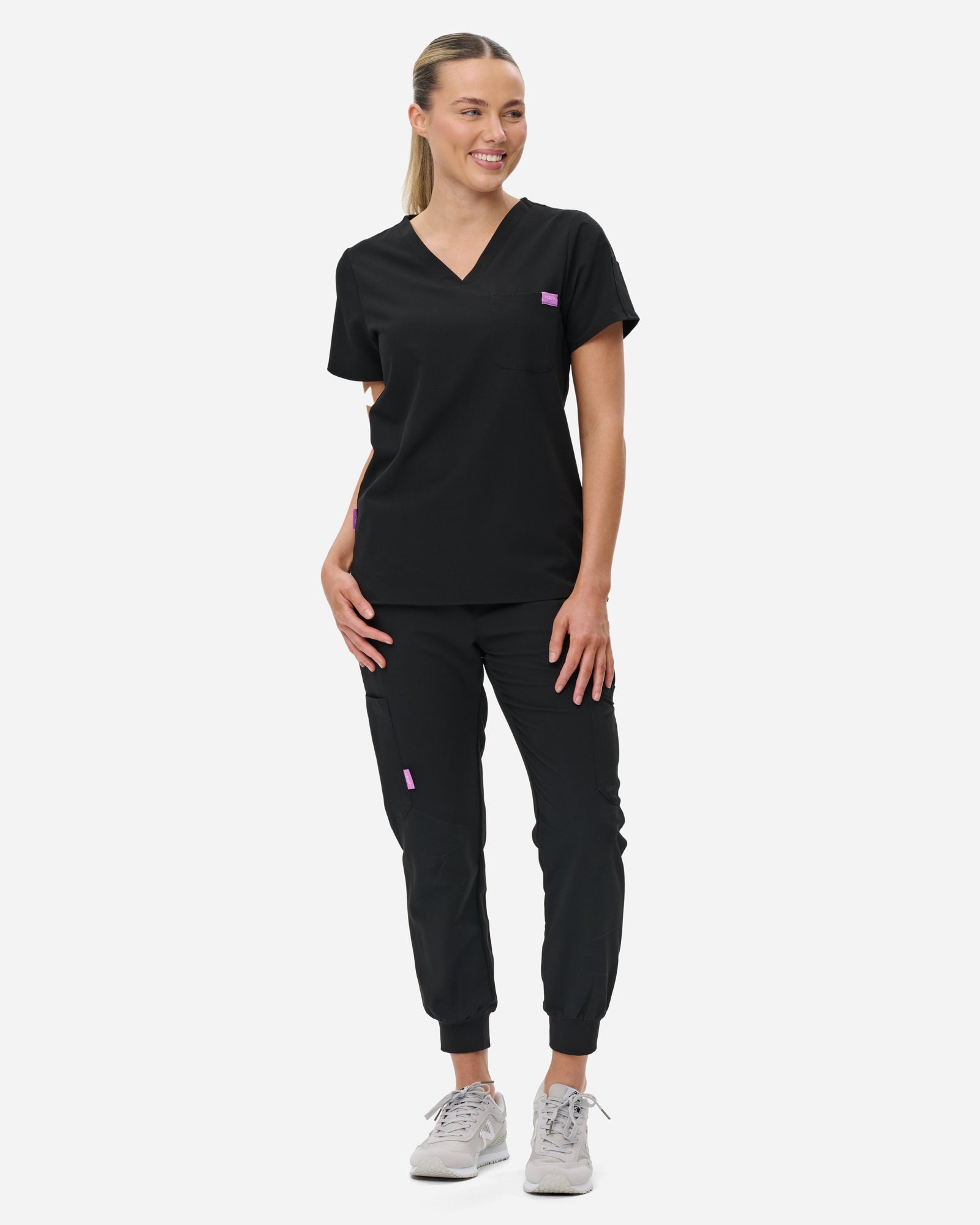 Experience unmatched comfort and durability with our Womens Scrub Jogger Pant from Epoch. Made with soft, stretchy fabric and featuring a convenient ring pocket inside the waistband and side pockets with velcro, these pants are designed for all-day wear. With a pop of color on the drawcord and cuffed legs, they are both stylish and long lasting. Upgrade your scrub game now.