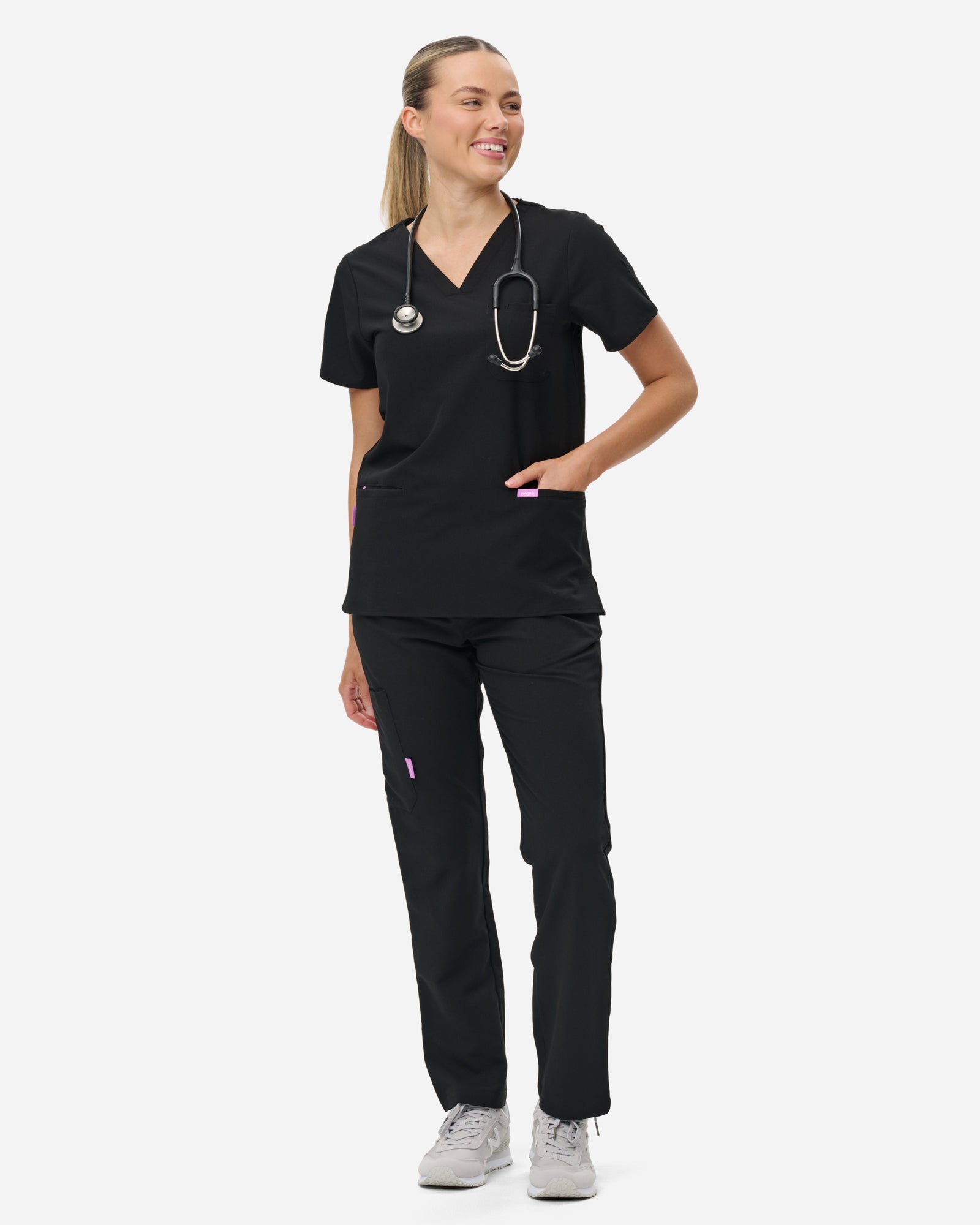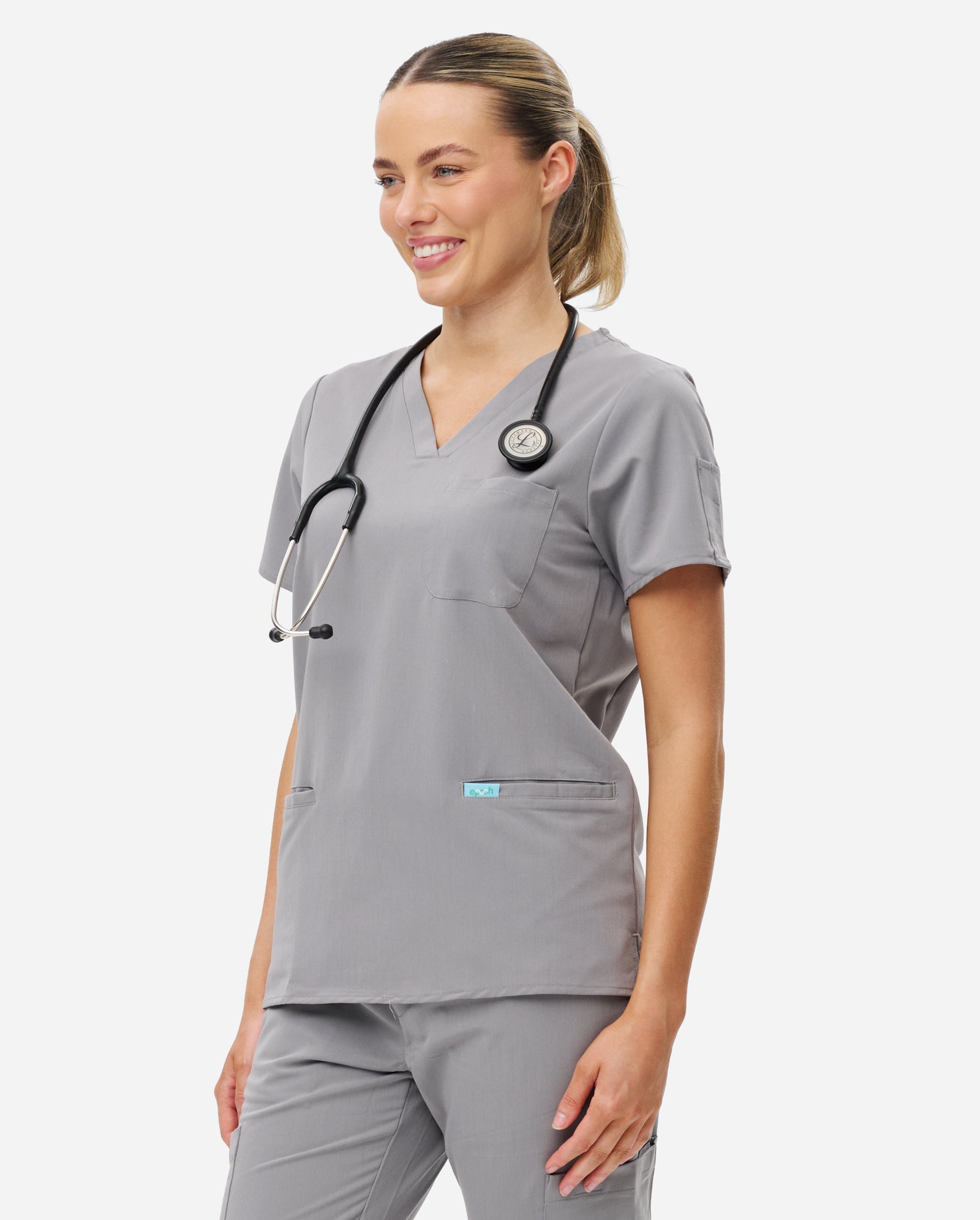 Expertly designed for the modern healthcare professional, this Womens 3-Pocket Scrub Top offers unbeatable comfort and functionality. With a pen pocket on the arm, two front pockets (including a hidden pocket), and a front chest pocket, you'll have all the storage you need for your essentials. Plus, the stretchy and soft fabric ensures all day comfort and a great fit.